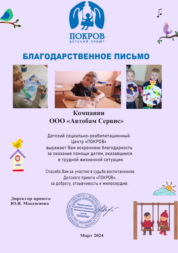 Оригинал благодарственного письма от Детского приюта «ПОКРОВ» (от марта 2024 г.)